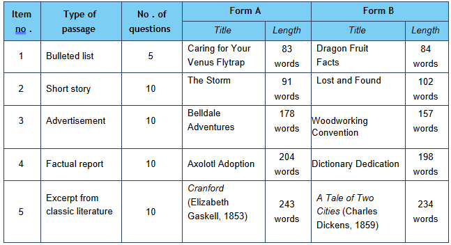Each of the two forms of the reading comprehension test comprises five passages of increasing length and difficulty. Each passage is accompanied by a number of multiple-choice questions that demand good literal and inferential reading comprehension skills. The characteristics of each passage are shown in Table 4. Passages in the reading comprehension test.