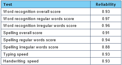 Table 3. Reliability coefficients (Cronbach’s alpha) for four of the tests in Exact show the coefficients of reliability for each of the Exact tests, calculated using Cronbach’s alpha statistic, which is a measure of the internal test consistency. Reading Comprehension results are not included here because this subtest has been updated since this study was completed. Note that the reliability coefficients shown in the table are all high (around 0.9). These results show that all the tests in Exact have satisfactory reliability.