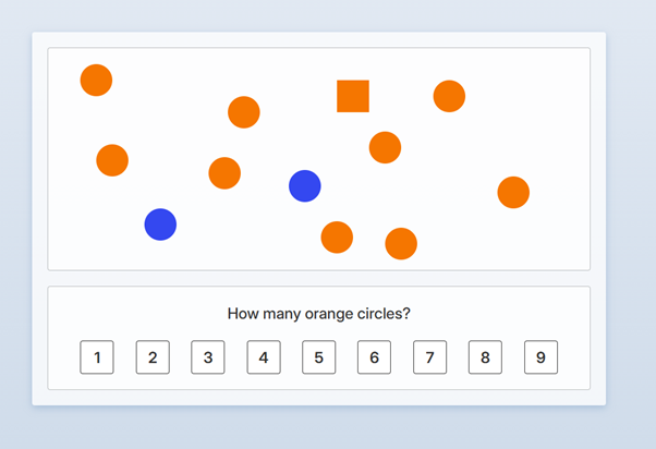 This is a test of central executive functioning that involves carrying out a sequence of between two and six independent counting tasks whilst simultaneously remembering the results of each count in the same order. In each count the child is presented with an array of different shapes, the numbers and locations of which are randomly generated, and is required to count the number of orange circles, selecting the correct answer at the bottom of the screen. At the end of each sequence of arrays they are asked to recall the number of orange circles in each counting array, in the same order in which they were presented.